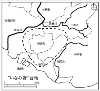 いなみ野台地は、稲美町を中心に周 辺の加古川市、三木市、明石市、神戸市の一部を含む地 域です。 加古川、明石川、美嚢川で区切られた台地で、河川より 30~40m ほど高い位置にあります。そのため古来から周辺の河川の水を利用することが困難であり、水に恵まれない地域でした。